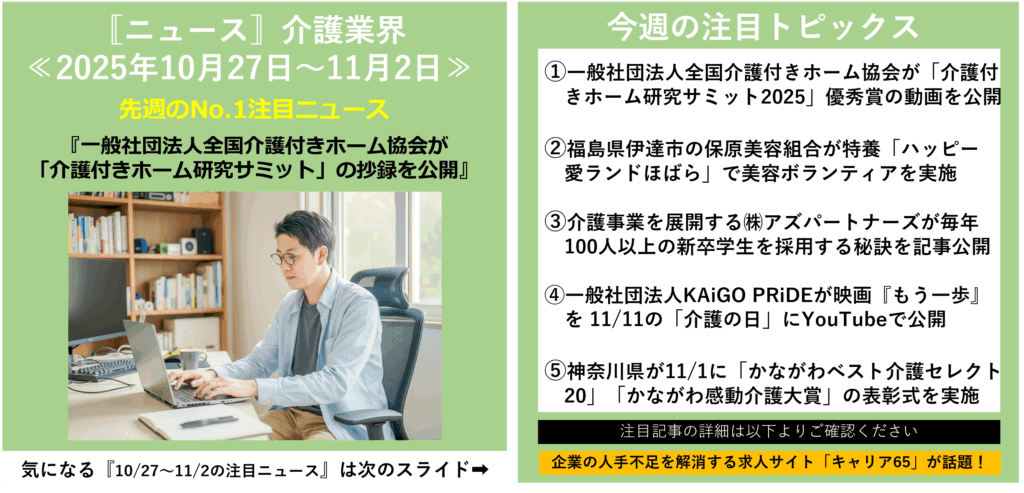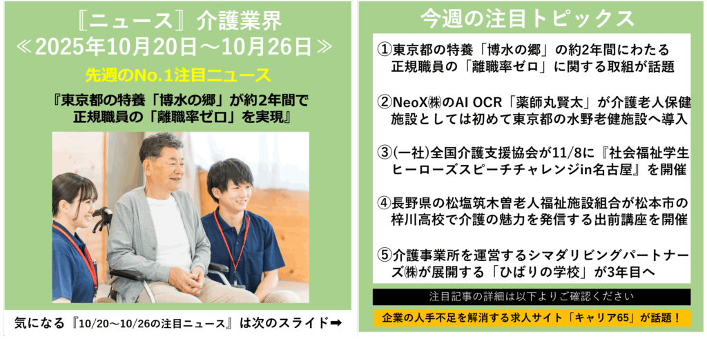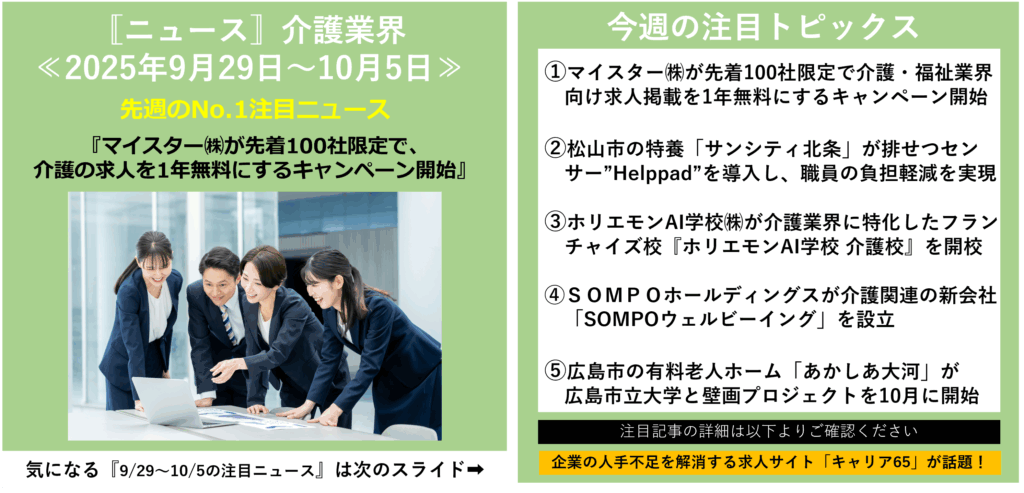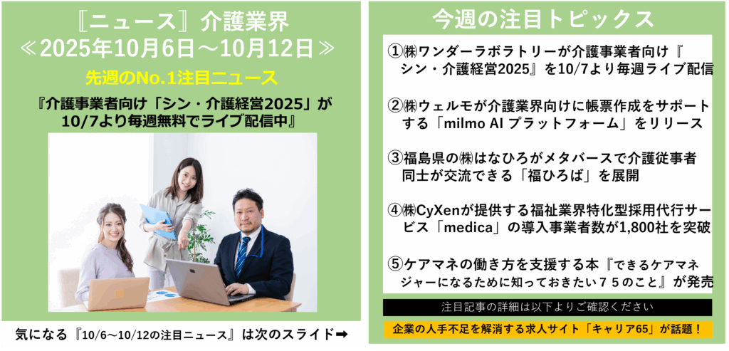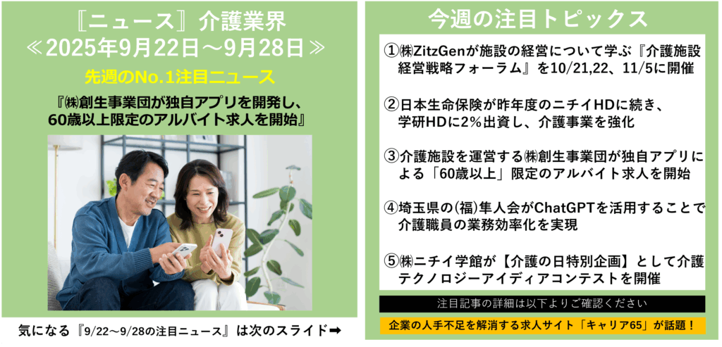 シニア人材の採用・育成・定着を考える人事担当者に向けて、今週注目された介護業界の最新ニュースをピックアップ。