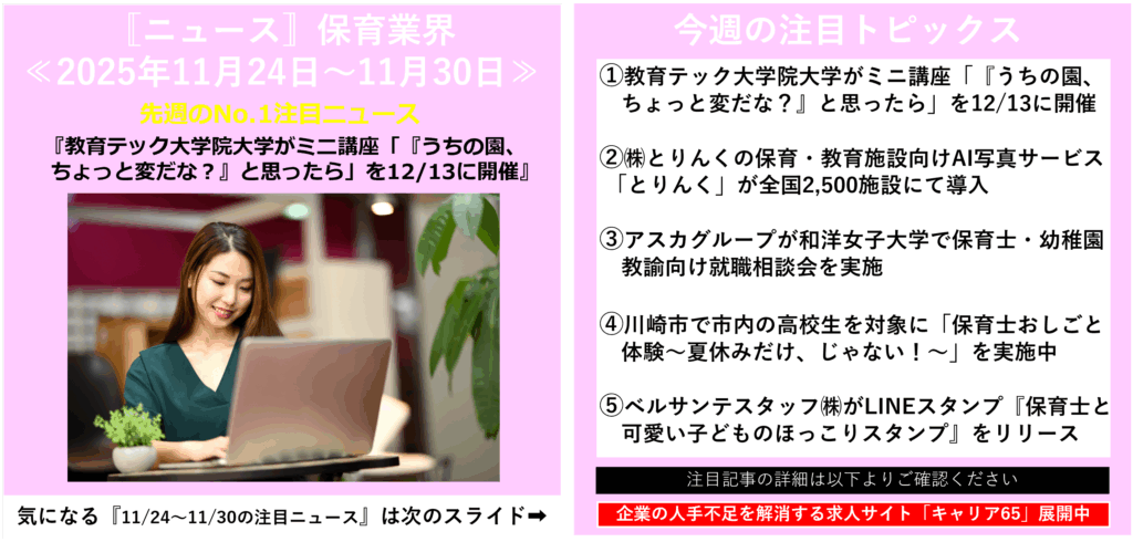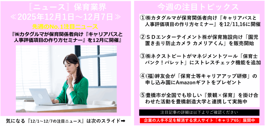 本記事では、今週注目された5つの最新ニュースを、保育施設の人事担当者の視点から「学び」「自園で活かせるヒント」に整理して解説します。