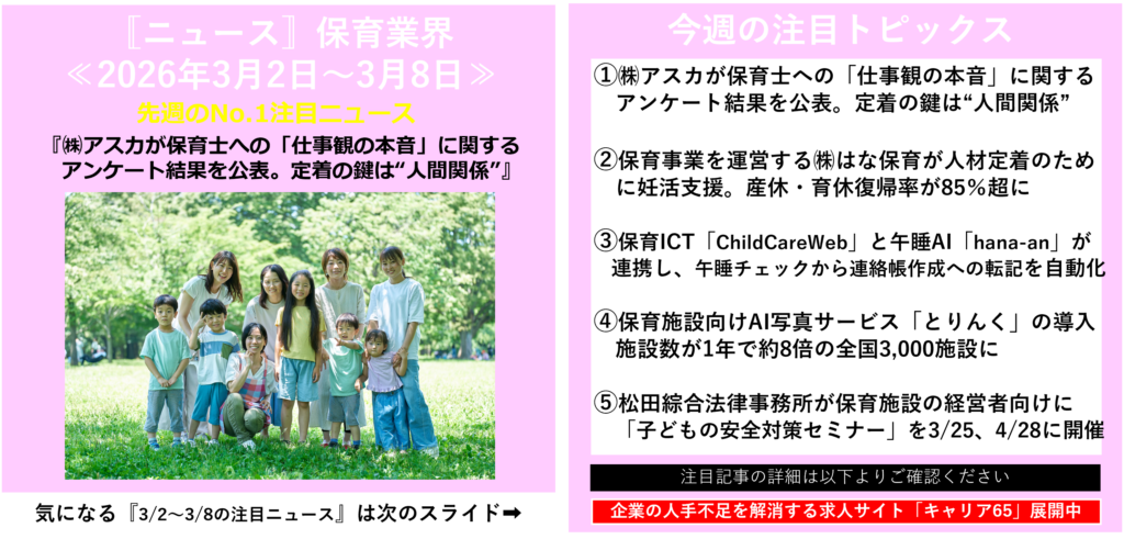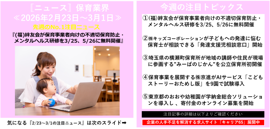このページでは、福祉業界の「保育分野」に関わるニュースを紹介していきます