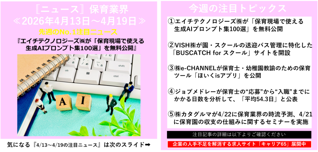 本記事では、採用成功を通じて会社に貢献し、人事のプロフェッショナルとしてさらに成長したいと願う皆様へ向けて、今週ぜひ押さえておきたい【保育業界の人事・採用関連ニュース5選】を厳選してお届けします。