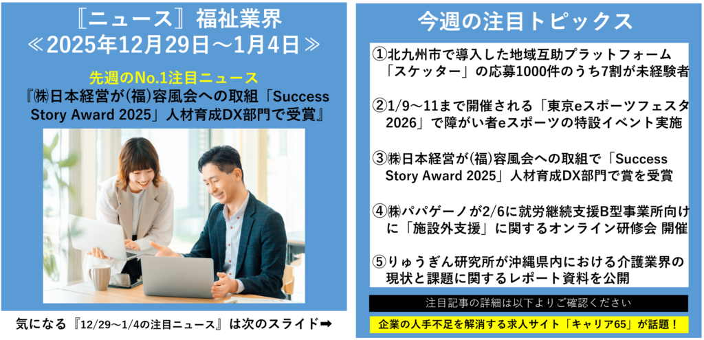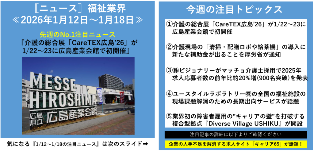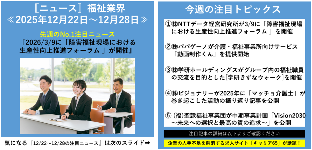 本記事では、「福祉業界 人事・採用 ニュース」 というキーワードで検索する人事マネージャーの方に向けて、今週注目すべき5つの福祉業界ニュース を取り上げ、